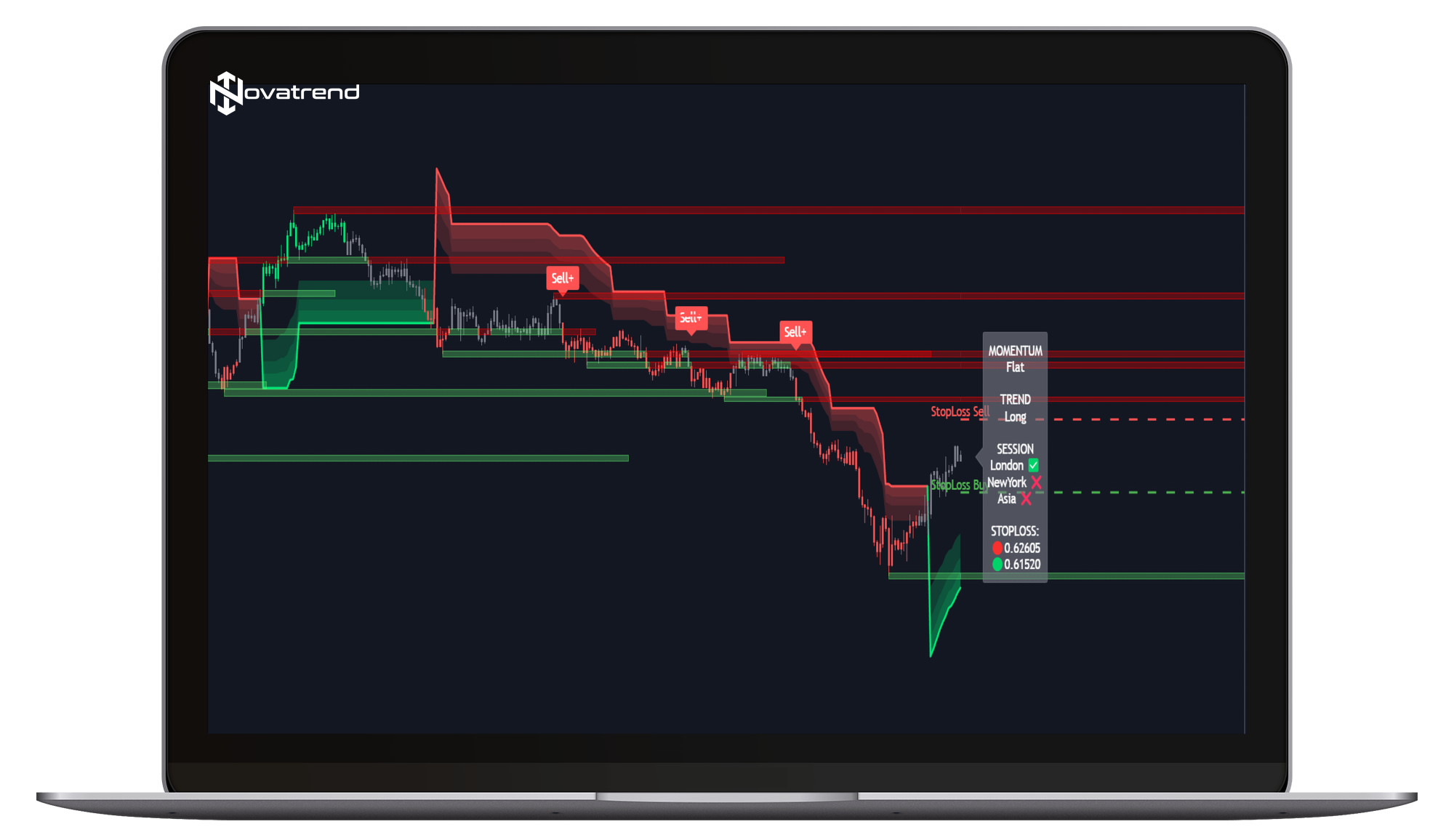 Grazie al potente algoritmo di NovaTrend puoi visualizzare la tendenza principale e i possibili punti di entrata in un colpo d'occhio.